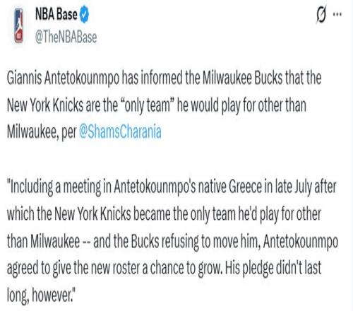 Shams還報(bào)道稱,字母哥已告知雄鹿:除雄鹿外,他只為紐約尼克斯效力?!叭ツ?月底,雙方在字母哥的家鄉(xiāng)希臘會(huì)面后,字母哥就明確——除雄鹿外,尼克斯是他唯一愿意效力的球隊(duì)。盡管如此,雄鹿仍拒絕交易他,字母哥才同意給新陣容一次磨合機(jī)會(huì)。然而,這份承諾并沒有維持多久?!?/p>