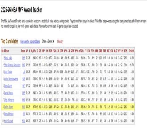 本賽季布朗場均34.5分鐘,拿到28.8分7籃板5.2助攻1搶斷0.4蓋帽,他幫助綠凱屹立東部第二,他在MVP榜單上排在第八的位置,本賽季有多位球星無緣65場規(guī)則無法評獎,布朗入選最佳一陣看上去已經(jīng)板上釘釘。