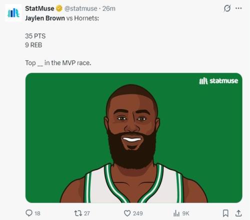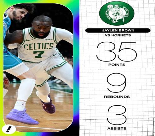 此役布朗全場比賽43分鐘,29中13,三分10中3,罰球7中6,拿到35分9籃板3助攻1搶斷1蓋帽,命中率44.8%,三分命中率30%,真實命中率54.6%,正負值+9,美媒力挺布朗是MVP。本賽季布朗與塔圖姆一同出戰(zhàn)時,布朗場均能拿到28分,綠凱戰(zhàn)績11勝2負。