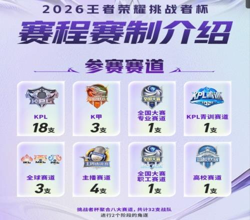 18支KPL戰(zhàn)隊(duì),3支K甲戰(zhàn)隊(duì),1支全國(guó)大賽專業(yè)賽道戰(zhàn)隊(duì),1支KPL青訓(xùn)賽道戰(zhàn)隊(duì),3支全球賽道戰(zhàn)隊(duì),4支主播賽道戰(zhàn)隊(duì),1支全國(guó)大賽職工賽道戰(zhàn)隊(duì),1支高校賽道戰(zhàn)隊(duì)。挑戰(zhàn)者杯聚合八大賽道,共計(jì)32支戰(zhàn)隊(duì),進(jìn)行兩個(gè)階段的角逐。