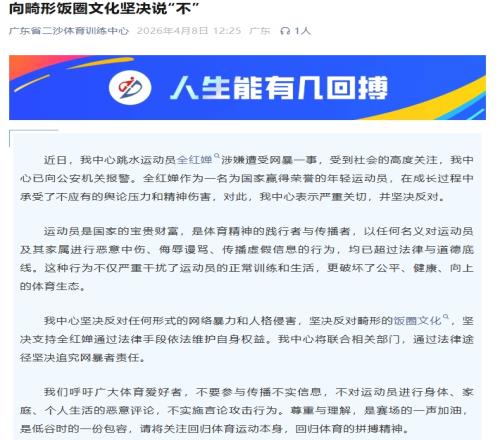 體育播報04月08日宣 廣東省二沙體育訓(xùn)練中心發(fā)布公告,就全紅嬋涉嫌遭受網(wǎng)暴一事已向公安機(jī)關(guān)報警。