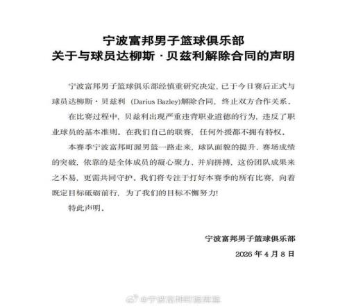 然而誰(shuí)也想不到,在僅出戰(zhàn)55秒的情況下貝茲利出現(xiàn)了不尊重比賽、不尊重隊(duì)友和教練組、管理層等一系列問(wèn)題,加上個(gè)人賽季表現(xiàn)一般,寧波隊(duì)賽后第一時(shí)間與其解約也就不意外了。