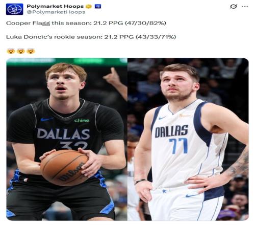 體育播報04月09日宣 數(shù)據(jù)媒體Polymarket Hoops更新動態(tài),曬出弗拉格和東契奇新秀賽季的數(shù)據(jù)對比: