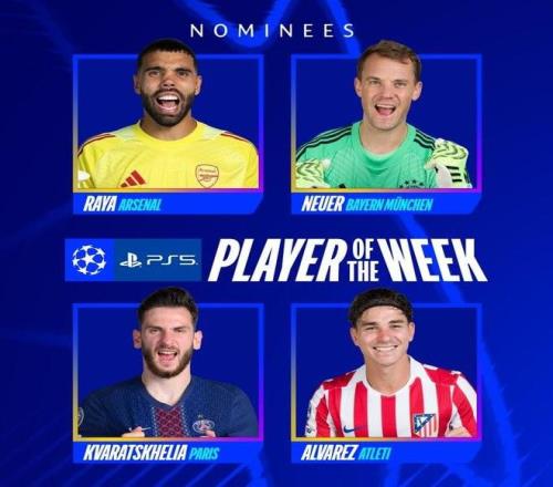 歐冠1/4決賽首回合4場(chǎng)比賽全部戰(zhàn)罷,歐冠官方公布了本周最佳球員候選名單,分別是戴維-拉亞、諾伊爾、克瓦拉茨赫利亞和阿爾瓦雷斯。