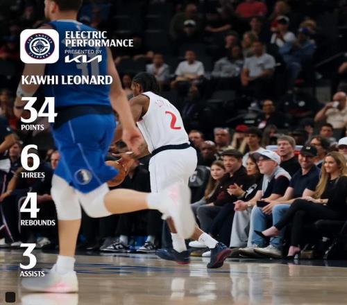 對(duì)陣獨(dú)行俠一戰(zhàn),科懷-倫納德30分鐘打卡(三節(jié))19中11,三分10中6,罰球9中6,拿到34分4籃板3助攻1搶斷,命中率57.9%,三分命中率60%。他連續(xù)55場(chǎng)比賽完成20+繼續(xù)刷新快船隊(duì)史紀(jì)錄。
