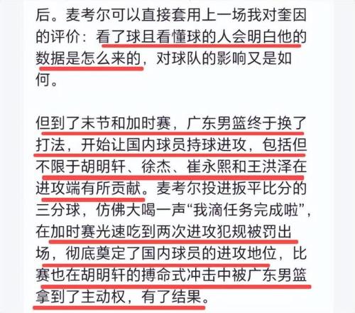 賽后媒體人不但沒(méi)有表?yè)P(yáng)麥考爾,反而否定了他的打法。如果加時(shí)賽不是他早早兩次進(jìn)攻犯規(guī)被罰下,那么廣東隊(duì)的進(jìn)攻就回不到正確的軌道上。媒體人麥穗豐說(shuō),“麥考爾可以直接套用上一場(chǎng)我對(duì)奎因的評(píng)價(jià):看了球且看懂球的人會(huì)明白他的數(shù)據(jù)是怎么來(lái)的,對(duì)球隊(duì)的影響又是如何?”麥穗豐的意思是,他殺敵一千,自損八百,他的打法不值得提倡。