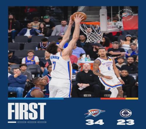 霍姆格倫連續(xù)送出暴扣,把快船內(nèi)線打爆了。首節(jié)霍姆格倫只打了8分鐘,6投5中砍下14分3籃板1助攻1搶斷。本賽季杰威一直打打停停,事實上霍姆格倫已經(jīng)打成了雷霆二當家。第一節(jié)打完,雷霆34-23領先快船11分。