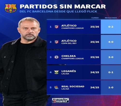 本場比賽,巴薩以0-2的比分輸給了馬競。根據(jù)統(tǒng)計(jì),這是弗里克執(zhí)教巴薩以來,球隊(duì)在各項(xiàng)賽事中第5次被對手零封。