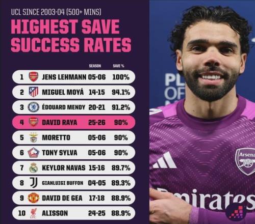 Opta統(tǒng)計(jì),自2003-04賽季以來,出戰(zhàn)500分鐘以上的門將中,歐冠單賽季撲救成功率排名里,本賽季拉亞以90%的撲救成功率排在第四位。