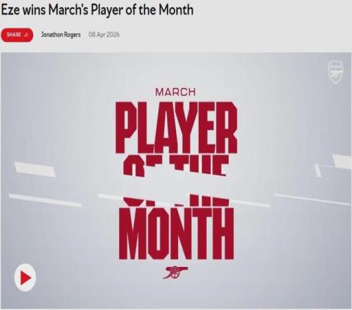 官方:阿森納宣布埃澤被評(píng)為了隊(duì)內(nèi)3月份最佳球員,英格蘭人得到了球迷37%的投票,拉亞和賴斯分列二三位。