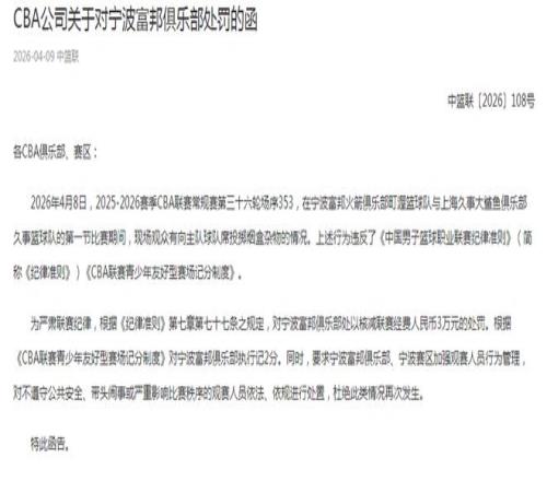 北京時(shí)間4月9日,CBA官宣最新罰單,針對(duì)4月8日寧波主場(chǎng)對(duì)陣上海第一節(jié),現(xiàn)場(chǎng)觀眾朝向主隊(duì)球隊(duì)席投擲煙盒雜物的情況,對(duì)寧波俱樂部核減聯(lián)賽經(jīng)費(fèi)3萬元,青少年友好型賽場(chǎng)記分扣2分。