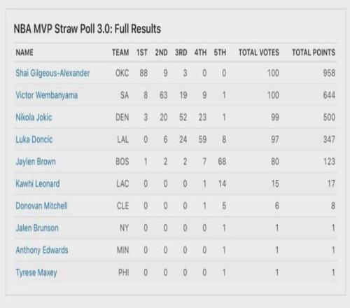 盡管NBA官方最新一期的MVP榜里,文班亞馬依然是榜首,但是此前ESPN的模擬投票結(jié)果,亞歷山大收獲了88張第一選票,文班亞馬只有8張,兩人差距巨大。