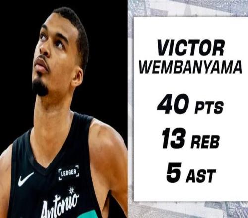 這場比賽,文班亞馬復出,然后再次交出炸裂表現(xiàn):全場只打了26分鐘,投籃23中14,三分7中2,罰球11中10,得到40分13籃板5助攻2蓋帽1搶斷。