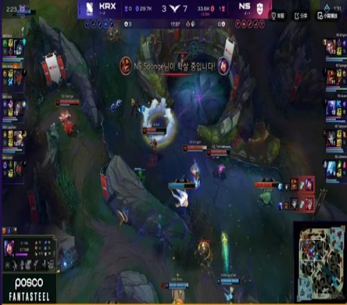【8:25】NS拿下第一條小龍!KRX換掉三蟲(chóng)!隨后Scout瑞茲開(kāi)疾跑包下避走位,幫助開(kāi)大的Taeyoon燼一槍狙死了Andil妮蔻!KRX也不甘示弱,三人包上強(qiáng)殺Kingen杰斯,NS也是效仿,三人又來(lái)下路再擊殺一次Andil妮蔻!這幾波節(jié)奏過(guò)后相當(dāng)于NS的1換2!