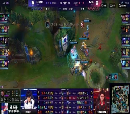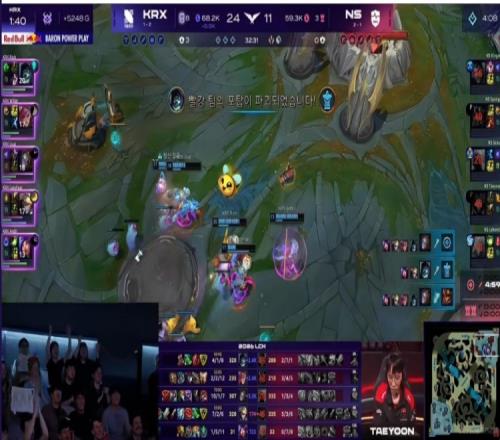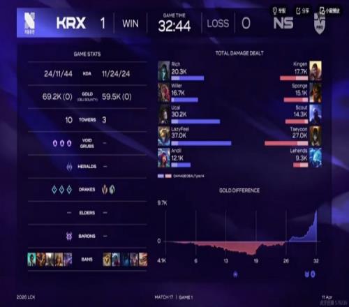 關(guān)鍵的上路河道團(tuán)NS為了追妮蔻,結(jié)果Kingen杰斯跳錘進(jìn)場(chǎng)吃到Willer蔚鎖頭白給了!這波KRX打出0換3直接都不需要移動(dòng)就能拿下大龍!隨后直接上路推進(jìn)UCAL發(fā)條大招又留人成功,Rich約里克則是中路越高地強(qiáng)殺Taeyoon燼這一NS唯一輸出點(diǎn)之后游戲結(jié)束!KRX一波0換5團(tuán)滅NS,結(jié)束首局比賽先拿一分!