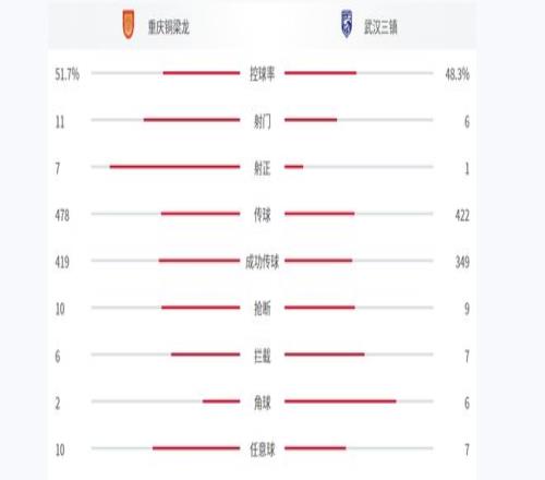 本場數(shù)據(jù)方面,銅梁龍與三鎮(zhèn)的控球率是51.7%-48.3%、射門是11-6、角球是2-6、搶斷是10-9。數(shù)據(jù)上,銅梁龍面對昔日中超冠軍,也完全不落下風(fēng)。
