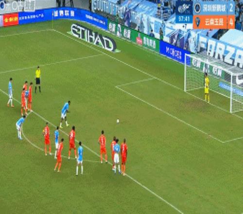全場補時階段第90+8分鐘,張宸梁手球送點,韋斯利操刀命中,新鵬城3-4!