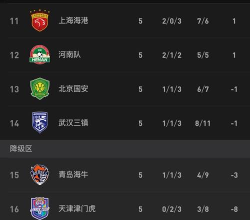 北京時間4月12日晚,中超第5輪比賽全部結(jié)束。本輪戰(zhàn)罷,仍有3隊不敗,而墊底的天津津門虎則依然一勝難求。5輪戰(zhàn)罷,仍有4隊積分為負數(shù)。