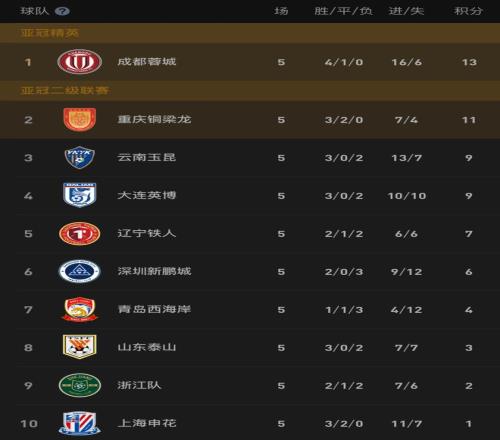 而重慶銅梁龍則在主場2-1力挫武漢三鎮(zhèn)。兩隊5輪后繼續(xù)不敗,而蓉城4勝1平積13分,依然以2分優(yōu)勢繼續(xù)力壓銅梁龍,領跑積分榜。