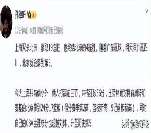上海雙殺北京,豪取19連勝,也終結(jié)北京的4連勝。隨著廣東贏球,明天深圳贏四川,北京就會(huì)落到第5。