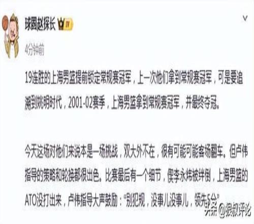 19連勝的上海男籃提前鎖定常規(guī)賽冠軍,上一次他們拿到常規(guī)賽冠軍,可是要追溯到姚明時(shí)代,2001-02賽季,上海男籃拿到常規(guī)賽冠軍,并最終奪冠。