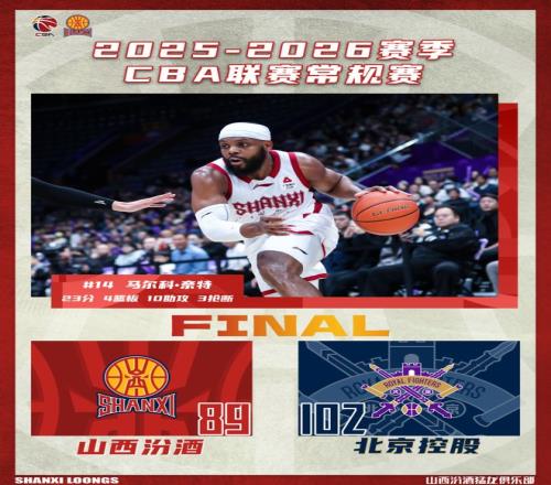 末節(jié)決戰(zhàn),豪斯率先拋投得分,賈明儒中距離命中,豪斯三分入網(wǎng)反超比分,山西隊請求暫停。暫停回來,北控隊持續(xù)將分差擴大,葛昭寶三分命中為山西隊止血,奈特跳投命中。本節(jié)末,山西隊始終無法限制對手得分,全場比賽結(jié)束,山西汾酒89:102不敵北京控股。