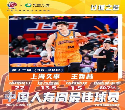 場(chǎng)均22分13.5板,官方:王哲林當(dāng)選常規(guī)賽第十二周最佳球員