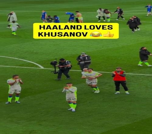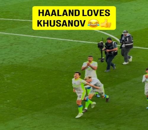 賽后曼城全隊(duì)向球迷謝場(chǎng)時(shí),胡桑諾夫有些不好意思接受球迷的掌聲,哈蘭德一把把他推到了球迷面前。