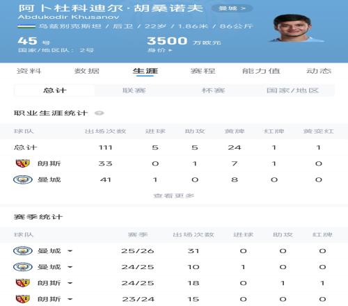 去年冬窗胡桑諾夫以4000萬(wàn)歐元的轉(zhuǎn)會(huì)費(fèi)加盟曼城,本賽季代表曼城出戰(zhàn)了31場(chǎng)比賽,目前胡桑諾夫的德轉(zhuǎn)身價(jià)為3500萬(wàn)歐元。