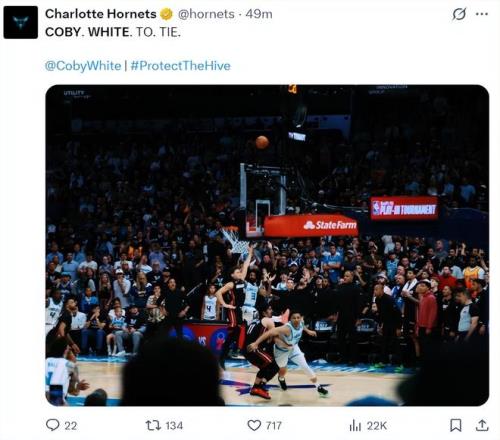 科比-懷特是黃蜂交易截止日才換來的新援,他這是黃蜂生涯的第第26場比賽,附加賽下半?yún)^(qū)的球隊是單敗淘汰賽,懷特這個三分球的含金量非常之高。
