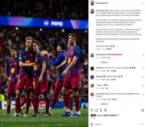 體育播報(bào)4月16日宣 在歐冠淘汰賽次回合,巴薩擊敗馬競(jìng),但依然被淘汰出局。德容也在社媒發(fā)文鼓勵(lì)球隊(duì)。