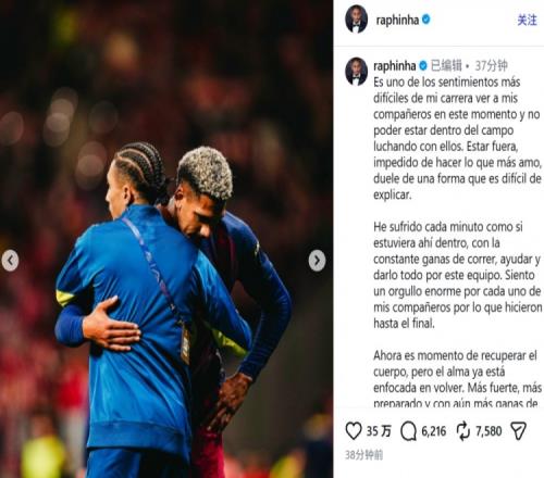 巴薩歐冠八強(qiáng)戰(zhàn)被馬競淘汰,在國家隊友誼賽受傷而因傷缺陣的拉菲尼亞賽后通過社媒發(fā)文。