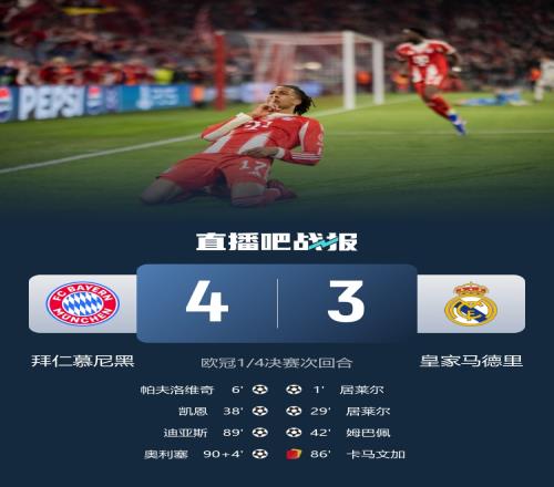 卡馬文加替補染紅,路易斯·迪亞斯和奧利塞世界波制勝。拜仁主場4-3十人皇馬,總比分6-4晉級四強(qiáng),半決賽將對陣巴黎。