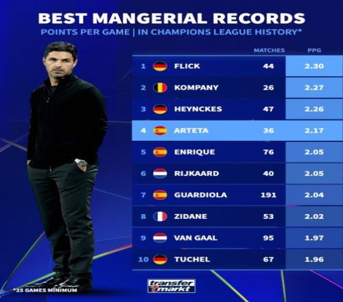 阿爾特塔以場(chǎng)均2.17分排在歷史第四,他一共執(zhí)教了36場(chǎng)歐冠,戰(zhàn)績(jī)?yōu)?4勝6平6負(fù)。他執(zhí)教的第一場(chǎng)歐冠是2023年對(duì)陣?yán)仕埂?/p>
