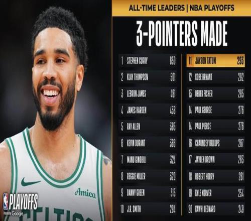 據(jù)統(tǒng)計(jì),本場比賽過后,塔圖姆生涯季后賽三分球命中總數(shù)正式超越科比-布萊恩特,升至NBA歷史第11位。