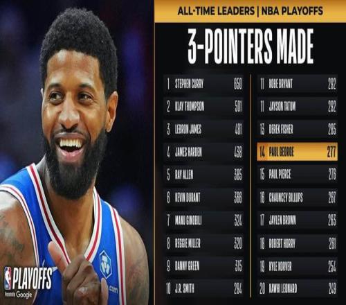 超越皮爾斯!喬治生涯季后賽三分球命中總數(shù)升至歷史第14位